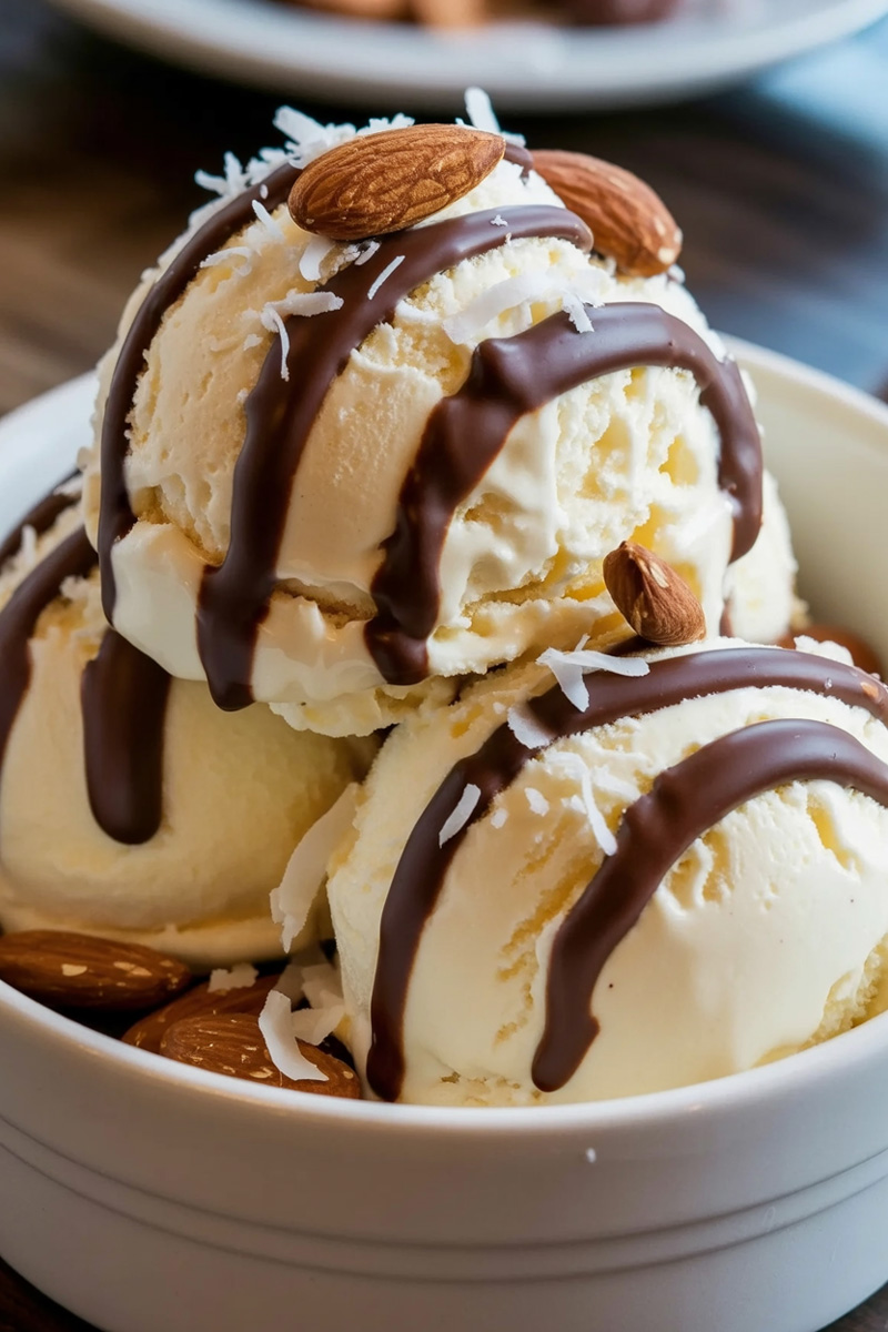 Scoop your ice cream into bowls or cones. For a beautiful finish, sprinkle a few extra toasted almonds, a pinch of coconut flakes, and maybe some mini chocolate chips on top.